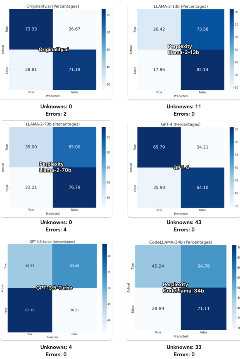 GPT-4 had the highest unknown rate at 34.2% followed by CodeLlama-34b with 27.5% making them both unreliable for the purposes of fact checking. Both Llama2-70b and Originality.ai had the lowest unknown rate at 0%.