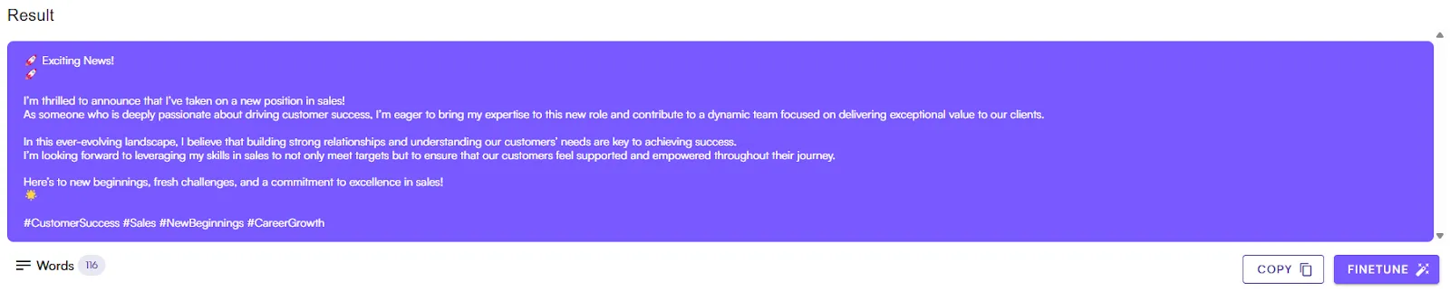 Looking to further refine your generated result? Select the fine-tune option. Alternatively, copy your generated LinkedIn post to your clipboard, or clear form to input new details and generate a new post.