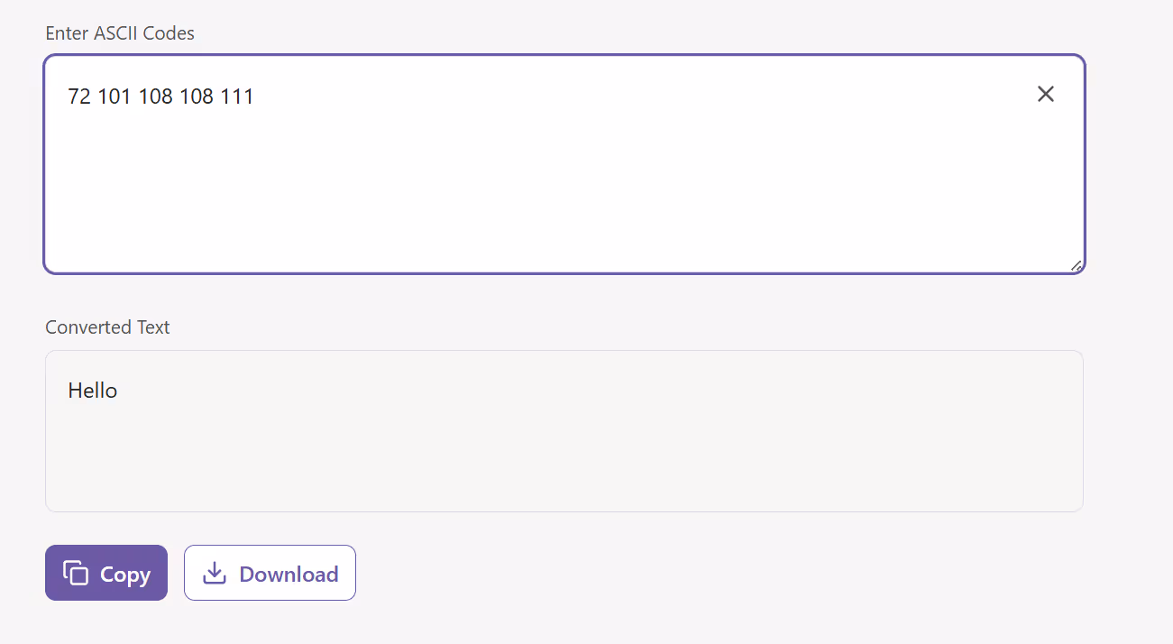 Automatic conversion – The tool automatically converts ASCII numbers into plain text as you type — no need to click any button.