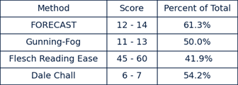 For example, readable.com recommends these readability scores: FORCAST grade of 9-10, Gunning Fog score of 8, and Flesch Reading Ease of 60 - 70. These scores are significantly lower than those we observed in online content that is ranking well on Google Search Engines.