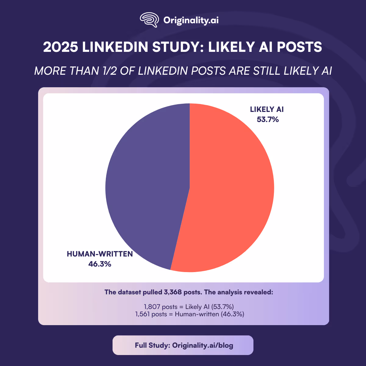 In this updated study, we analyzed posts published from January 2025 to November 2025 by using a real-time LinkedIn API to analyze 99 profiles of influential voices across industries that contained over 100 words. After collecting the dataset, we ran each post through our AI detector.