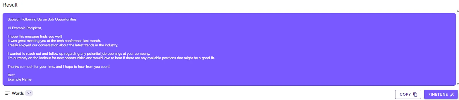 Now, it's time to let the tool create a professional, tailored message. This tool generates a LinkedIn message for connections, networking, outreach, or sales fast! It processes the inputs and uses them to write a polished message that is ready for use. Copy the generated message to your clipboard or fine-tune it to refine the messaging further.