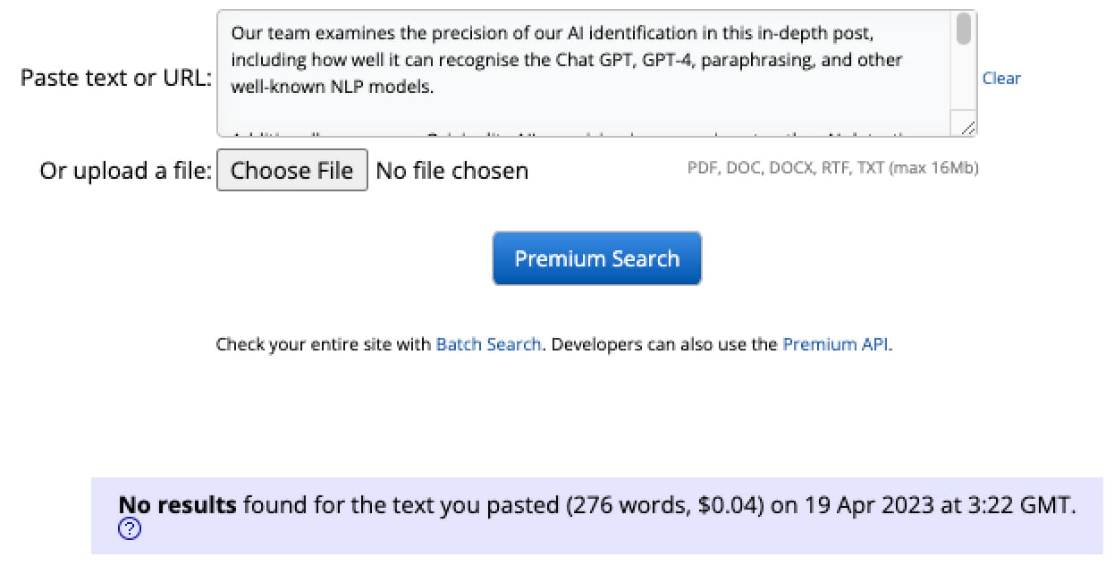For a more in-depth look at how our AI works read this article – https://originality.ai/how-does-ai-content-detection-work/