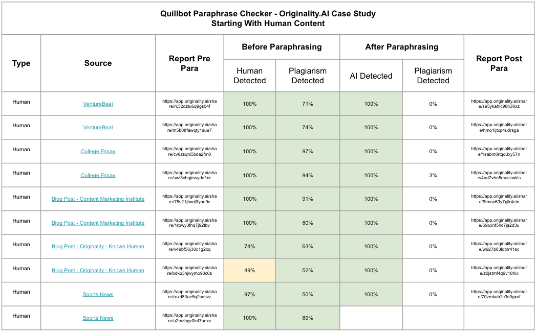 Whether content starts as Human Generated or AI-Generated once the content has been run through a paraphrasing tool it became undetectable to all AI Detectors and Plagiarism Checkers EXCEPT Originality.AI!