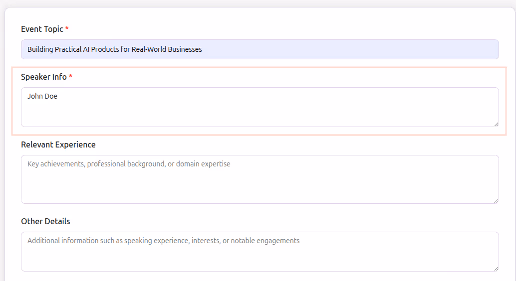 This tool converts structured speaker information into a well-written biography aligned with the event topic. It ensures clarity, relevance, and professionalism while keeping the content easy to read and ready to publish.