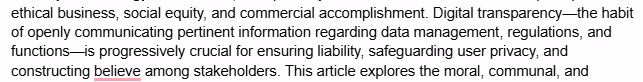 "Write a well-researched article on the importance of digital transparency in modern society. Discuss the ethical, social, and business implications of transparency in the digital age. Explain how digital transparency builds trust, fosters accountability, and protects user privacy. Include real-world examples of companies or organizations that have successfully implemented transparent practices, and highlight the risks of a lack of transparency in digital platforms and technologies. Conclude by providing actionable recommendations for businesses and policymakers to improve digital transparency."