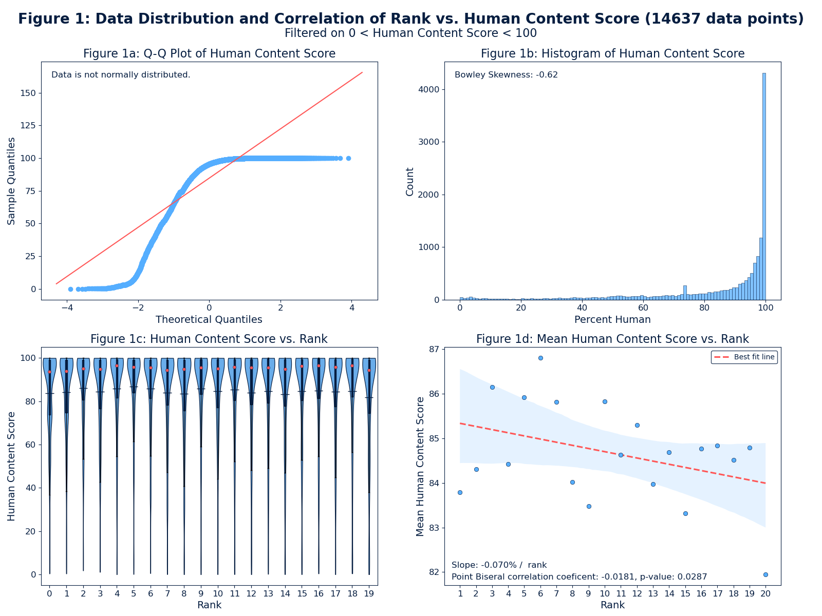 The analysis was challenging because of our irregular data distribution. As you can see in Figure 1, the Originality.AI human content score vs Google rank has a non-normal distribution and high skewness. Correlation coefficients and p-values were calculated and reveal higher Originality.AI human content scores correlate to better Google rank. Our calculations show the confidence of this correlation is high, but the correlation is very weak. However, we weren’t done yet.