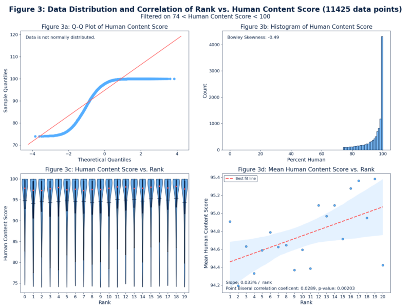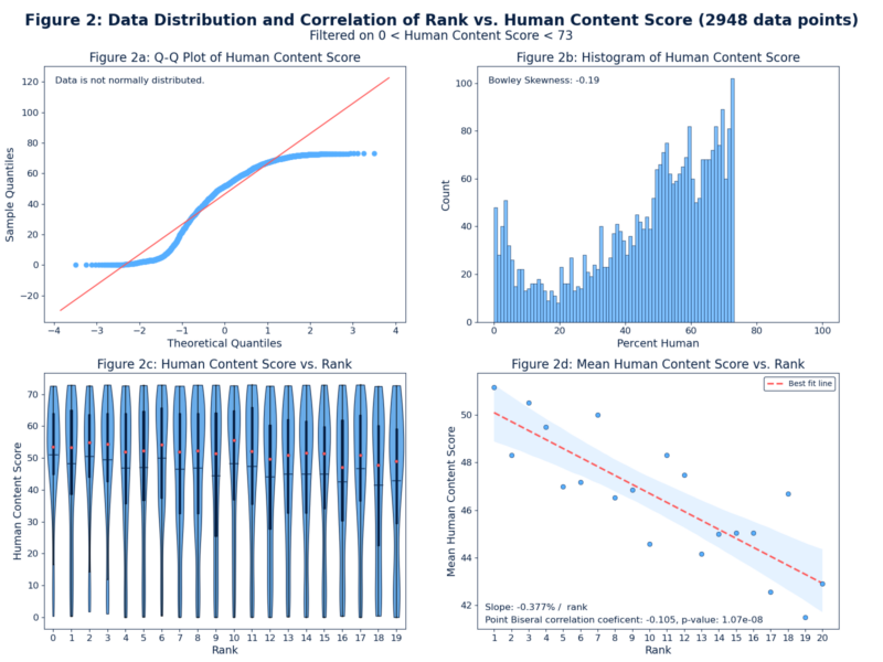 Now don’t get excited, we aren’t saying we believe Google would ever punish content with high human content scores. That’s clearly not the case. But it does confirm we chose a good place to split our data and it seems different factors are at play above and below the split. Our interpretation is that Originality.AI human content scores below 75% correlate to better Google rank, and because the inverse correlation above 75% can’t be true, there is no correlation above that point. The implication is that Google prioritizes human-generated content up to an acceptable threshold, after which other SEO factors become more significant in determining ranking.