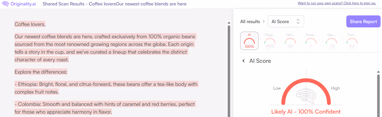 Based on our tests, only Originality.ai scored the Writemail AI email as 100% Likely AI.