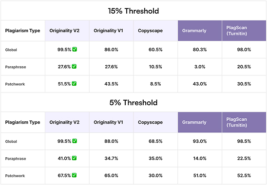 Originality.ai is the most accurate of all plagiarism checkers tested. For a complete analysis of comparative accuracy to competitors, visit our Plagiarism Accuracy Study (as a quick snapshot of comparative accuracy for patchwork plagiarism: Copyscape 30% vs. Grammarly 51% vs. Turnitin 52%).